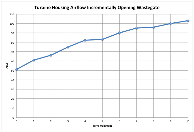 I loosed the nut on the wastegate actuator arm to the point where the disk that covers the wastegate port could just start to spin. From there I made single turns of the nut, one 360 degree rotation about the actuator arm, and took an airflow reading with the flapper door open the amount corresponding to that one turn.