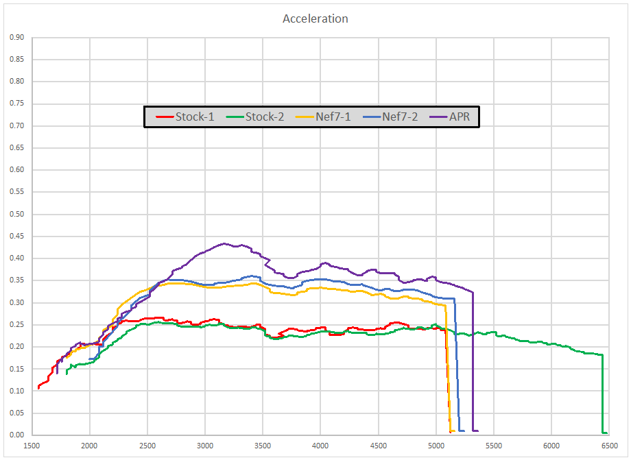 This chart shows a comparison of the 7th iteration of the Nefmoto community 2.7 tune with the stock B5 S4 tune and also a log I have from a different APR chipped car. The APR car is not mine, nor is it as extensively modified along the intake and exhaust airflow paths, the point of putting the data on the chart is to give a sense of about where the Nef7 tune falls in comparison to two other tunes that have widespread use.