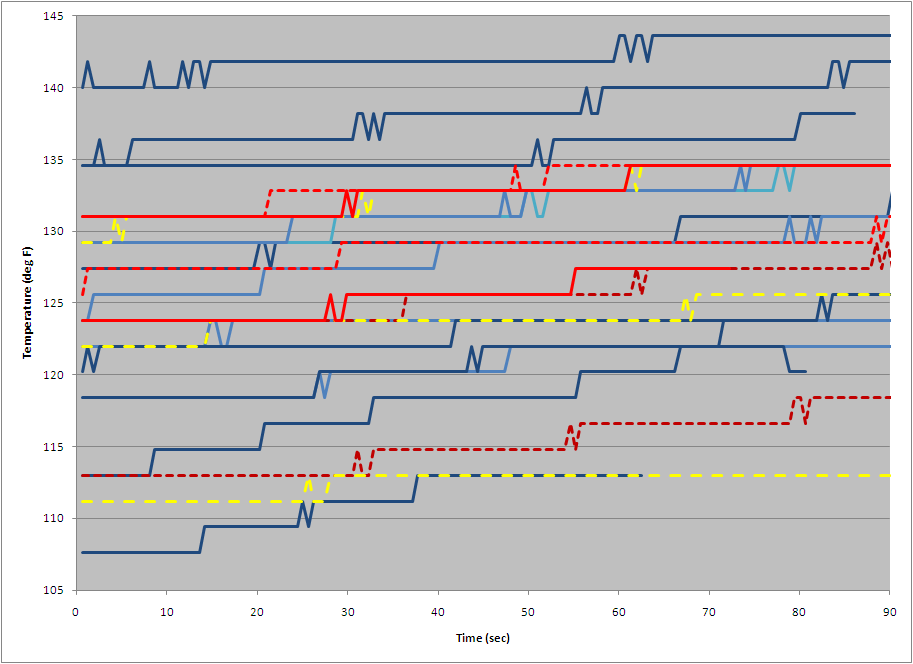 One obvious conclusion from this data is that for a lower starting manifold temperature, there will be a greater temperature rise. Another observation is that regardless of the starting temperature and the duration of the drive the upper end of the temperature rise will lie within a fairly narrow band from about 150-170 degrees F. There are a couple of factors that can impact these results which are not shown with this chart. The first is the influence that the driving conditions have, for instance stop and go driving versus steady state highway. The other is the ambient air temperature. For these tests a point was made to collect information in temperature conditions that were similar, always above 70F, and predominantly when the temperature was in the mid-80 to mid-90 F range. It is very likely that if the ambient air temperature had been 40F the entire graph of results would have been shifted.