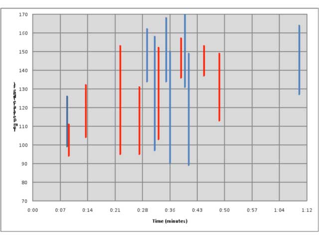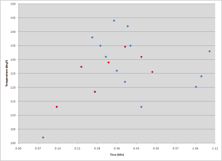 Not surprisingly over time the recorded temperature of the air rises as the intake manifold transfers heat into the air. For comparison purposes it becomes necessary to pick a time at which the temperature will be noted, for this comparison a reading 90 seconds after the engine is shut off was recorded. This was done to allow some heating of the air to occur, but it could also be expected that the intake manifold itself would continue to warm up over time, so a reasonable short time period was selected. Figure 2 shows the temperature at 90 seconds, along with how long the car was driven prior to recording the temperature.