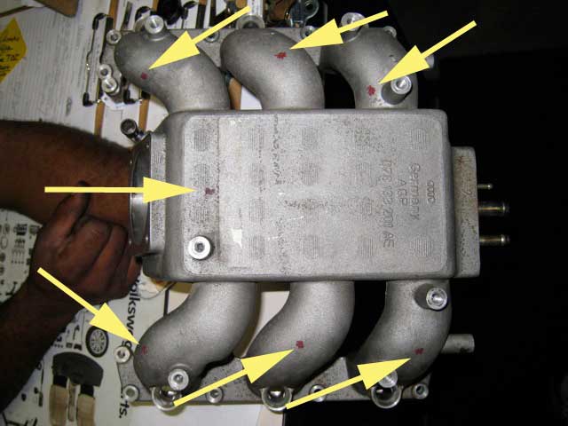 Determining the temperature of the intake manifold was easier in some respects since the exterior surface is exposed. There were two measurements made, the first was with an infrared thermometer at seven marked points on the intake manifold. Six locations were on the intake runners, and the seventh at the center of the component (picture 2). The readings at these locations were taken prior to starting the engine and then immediately upon engine shut off.