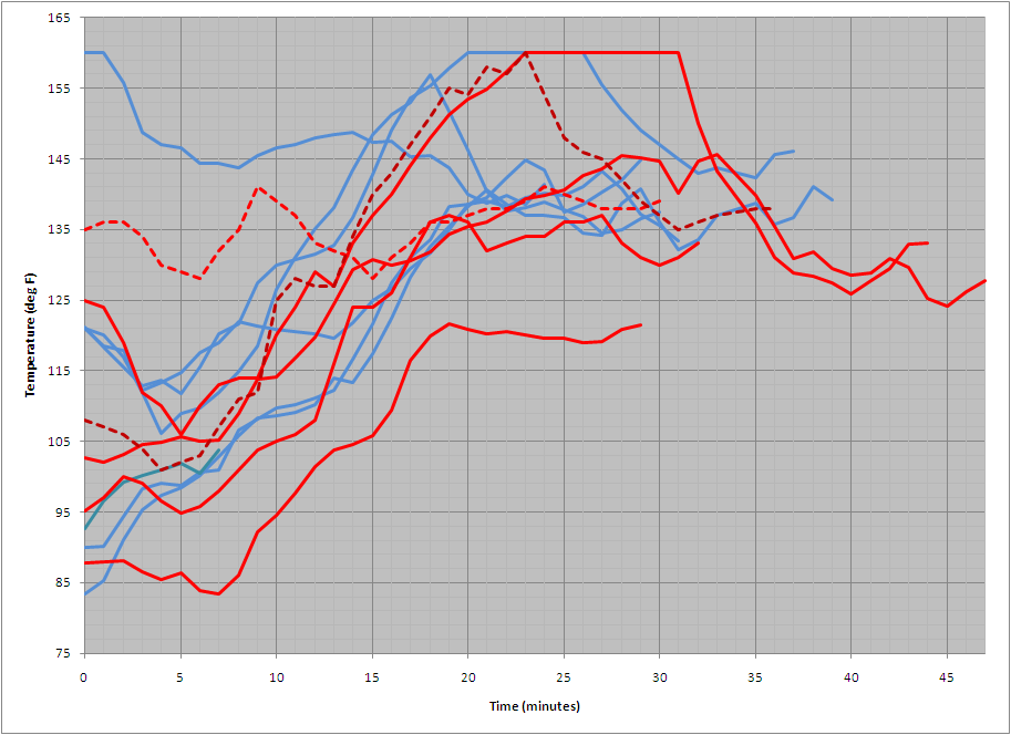 A couple of extreme cases are shown, in one case with the phenolic spacers in place the temperature rose quite slowly and leveled off and at lower level than all other cases. Coincidentally this occurred on the first collection following installation of the phenolic spacers. It can possibly be explained by the driving style which was very different from the commuting that was done during most of the other collection sessions.
