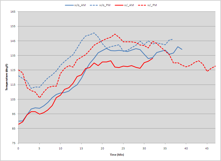 When the car is started first thing in the morning after a night of cooling down the starting temperature is low, and the temperature rises steadily over time. In the other case, when the car has been driven previously and then sat for some time, it is not uncommon to see the manifold temperature drop for several minutes, and then reverse and begin to climb again. This is occurring because after the car sits the manifold temperature rises. As was shown in figure 4, within an hour or two of engine shut off the manifold temperature is substantially higher than when the engine was running. Even after sitting for 400 minutes, a little more than six and a half hours, the manifold temperature will typically be only 10-15 degrees F cooler than when the engine was shut off.