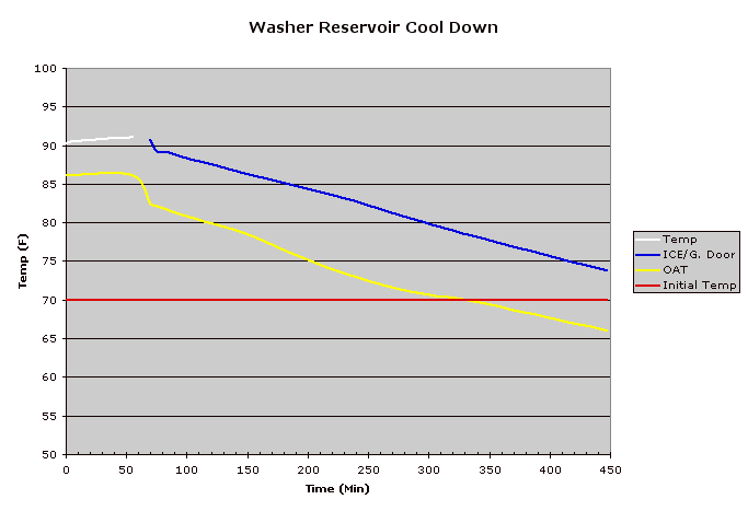The second chart illustrates how long it takes for the washer reservoir fluid to cool down after having been heated and also the rate of cooling of the outside air as it becomes later in the day and into the evening. After approximately one hour of sitting in my garage with the door closed I opened the garage door to provide additional cooling. At this time I also added three ice cubes to the reservoir to observe the impact on the temperature drop. For reference purposes I put the starting temperature of the reservoir fluid.