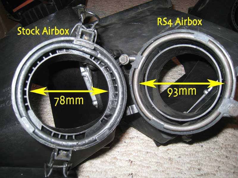 The stock S4 MAF and EPL MAF work with the stock S4 airbox, which I had available for use. The RS4 MAF affixes to the RS4 airbox top, which I also have, and is able to attach to the stock S4 airbox bottom half.