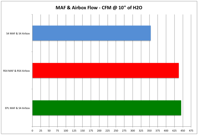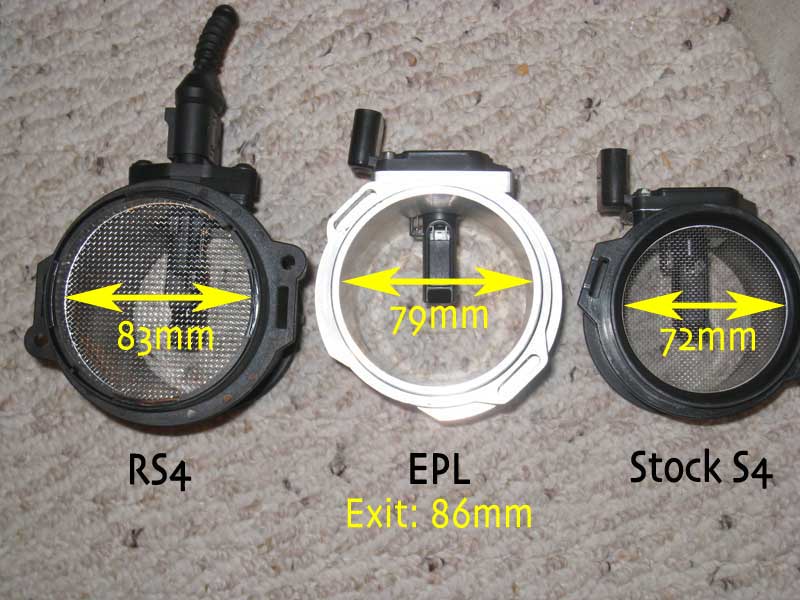 The most dramatic change comes simply by swapping out the stock S4 MAF housing for the EPL housing. The result is a 25% gain in airflow.