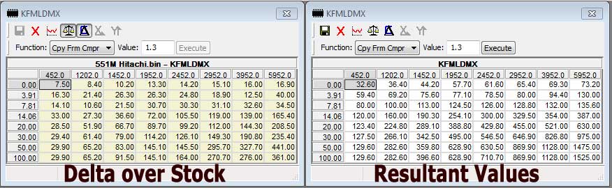 Here are the changes made to KFTARX, an IAT correction modified in order to prevent the ECU from pulling load when the air temps are cooler, and KFMIOP, which is a cap on the torque request. Left is the delta from a stock tune for the values that were changed, and the right are the resultant values being used.