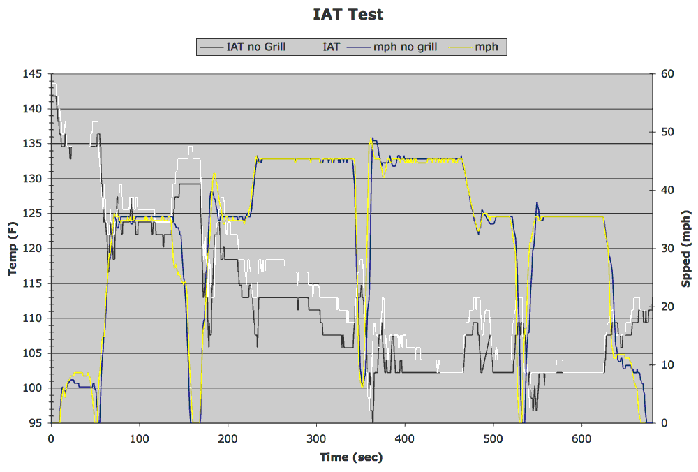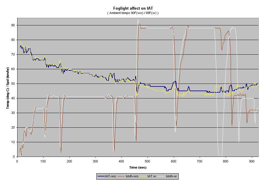 I had hypothesized that at lower speeds the absence of the foglights would allow the ICs to cool more rapidly, but the results of my test did not show that to be the case. I would have thought that they would have reached steady state temperature quicker at highway speeds also, but again that did not turn out to be the results I got on this test.