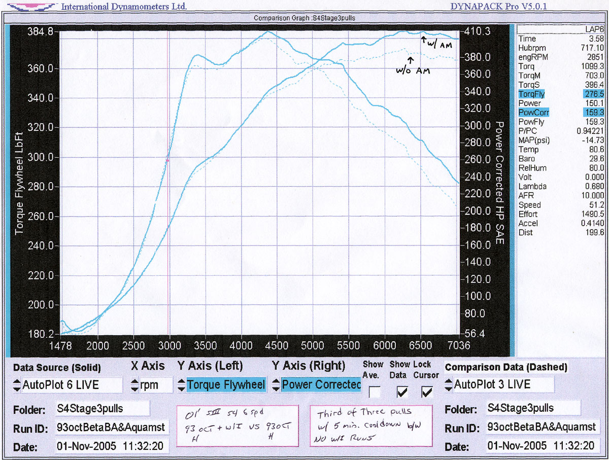 In conjunction with APR revising their Stage 3 software using my car I requested that they try and tailor the 93 octane file to operate in conjunction with my Aquamist water injection system. The results are shown in the chart below, an improvement of approximately 25 whp with the 93-water injection tune was realized.