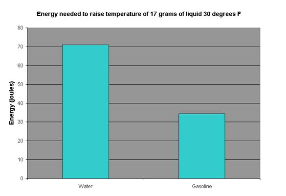 Specific heat is used when describing the capacity for heat absorption. Specific heat is the amount of heat energy (joules) per unit mass (grams) required to raise the temperature of a substance by one degree Celsius. The greater the specific heat, the more energy a substance absorbs before it heats up. Gasoline has a specific heat value of 2.02 joule/gram-°C. Water has a specific heat of 4.18 joule/gram-°C. This means, for an equivalent volume, liquid water will absorb about twice as much heat as gasoline while increasing in temperature the same amount. Or put another way, for a given quantity of gasoline, half as much water is as effective when it comes to absorbing heat energy.
