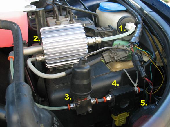 Once the boost threshold has been met the system activates and a high-speed valve opens allowing the water to be drawn from the windshield washer reservoir and through a filter (1 below) by the 100-psi pump (2). An inline regulator allows the water pressure to be adjusted as desired (3). The water goes through a flow meter (4), the high-speed valve (5), and a 100cc accumulator (not shown), that acts as a reservoir and shock absorber. The accumulator smoothes out the pulses from the pump and enables the system to flow slightly more water than would be possible from the pump alone. An added benefit of the accumulator is to provide additional safety in the event of a pump or high-speed valve failure. Should either of those components fail during operation, the accumulator has enough stored water under pressure to continue injecting water for 5-10 seconds.