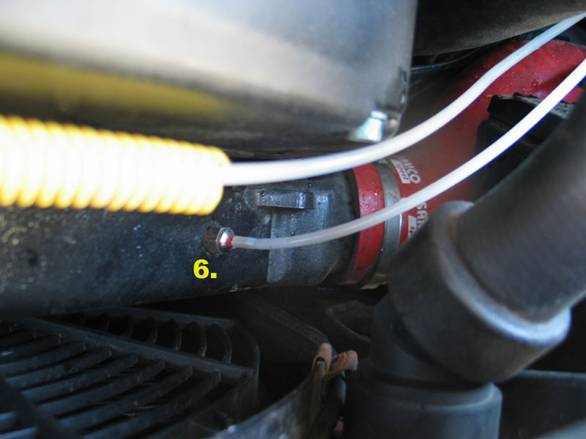 These jet nozzles turn the water into a fine mist and discharge it into the intake air stream (6). Placement of the jet nozzles is a subject unto its own, with various options being available. The most common locations for the jet nozzles are before the turbochargers, after the intercoolers, or into the intake manifold. There are various reasons why each location may be chosen, with differing results depending upon location, but the most common location is after the intercoolers, which is what I chose to do.
