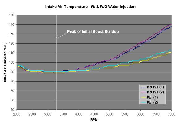 The benefit is most apparent when a series of high boost pulls are made. A situation that will commonly lead to heat soak for a turbocharged car with intercoolers is no problem for an engine with water-injection.