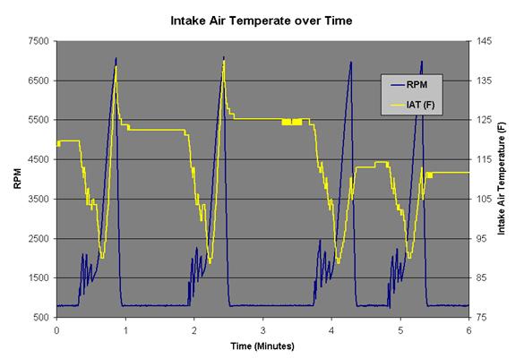 The most immediate benefit from water injection is the lowering of intake air temperatures. This can be realized even with a simple setup. The chart below shows how the intake air temperature on my S4 was affected with the addition of water injection.
