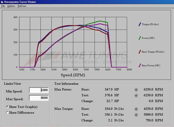 When all was said and done, and APR was finished with their work, the car went back to the dynamometer. The chart below shows back-to-back tests comparing the standard 93-octane software to the water injection software. The base case is the standard 93-octane program and the test case is the 93-octane water injection program. An impressive 22-wheel horsepower, or roughly 30 more crank horsepower, were produced with water injection activated.
