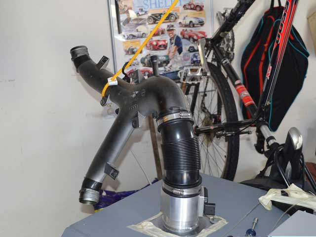 To see how the stock y-pipe compared to the RS4 y-pipe I built an adapter to fit my 85mm MAF housing so I could attach the MAF housing, accordion (RS4) and the two y-pipes to the flow bench.