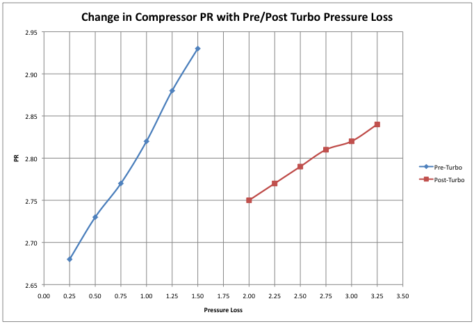 The most notable aspect of this chart is the rate of change of PR for the pre-turbo case versus the post-turbo case. The pressure ratio at the turbo compressor is much more sensitive to changes in pressure losses on the intake side of the compressor. Roughly two and a half times more change occurs pre-turbo as compared to post turbo. For me, the takeaway from this is that minimizing pressure losses on the intake side of the turbocharger can provided more benefit to the turbo than equivalent improvements on the post-turbo charger side of intake. If you are looking to optimize turbo performance, it is important to address the intake side of the turbo.